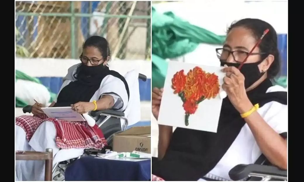 Mamata, who arrived at the Mayo road venue in the morning and began her sit-in next to a Mahatma Gandhi statue, turned to paints and canvases and produced at least two paintings while sitting on her wheelchair.