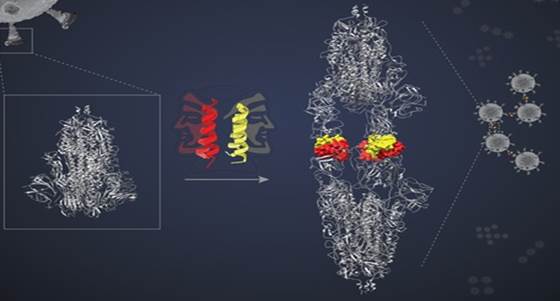 The SIH-5 peptide was designed to block the binding of the RBD to human ACE2. When a SIH-5 dimer encountered an S protein, one of its faces bound tightly to one of the three RBDs on the S protein trimer, and the other face bound to an RBD from a different S protein. This ‘cross-linking’ allowed the SIH-5 to block both S proteins at the same time.